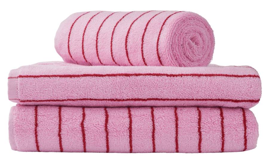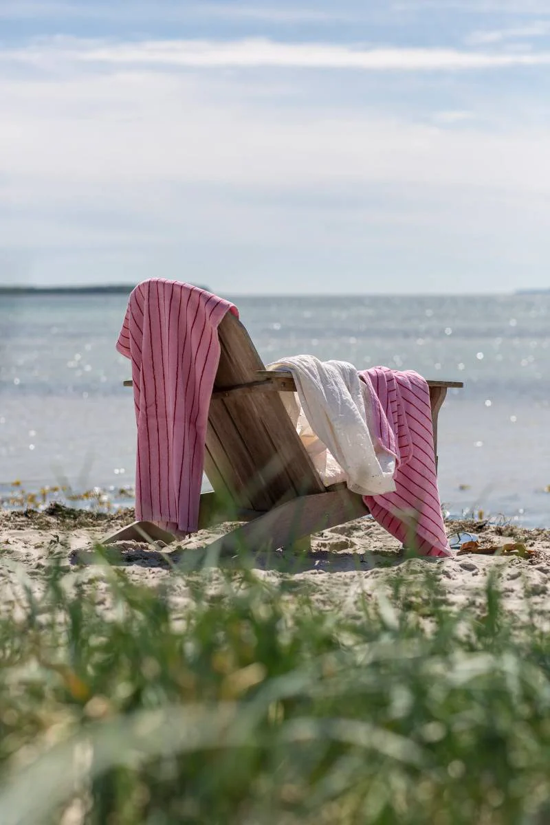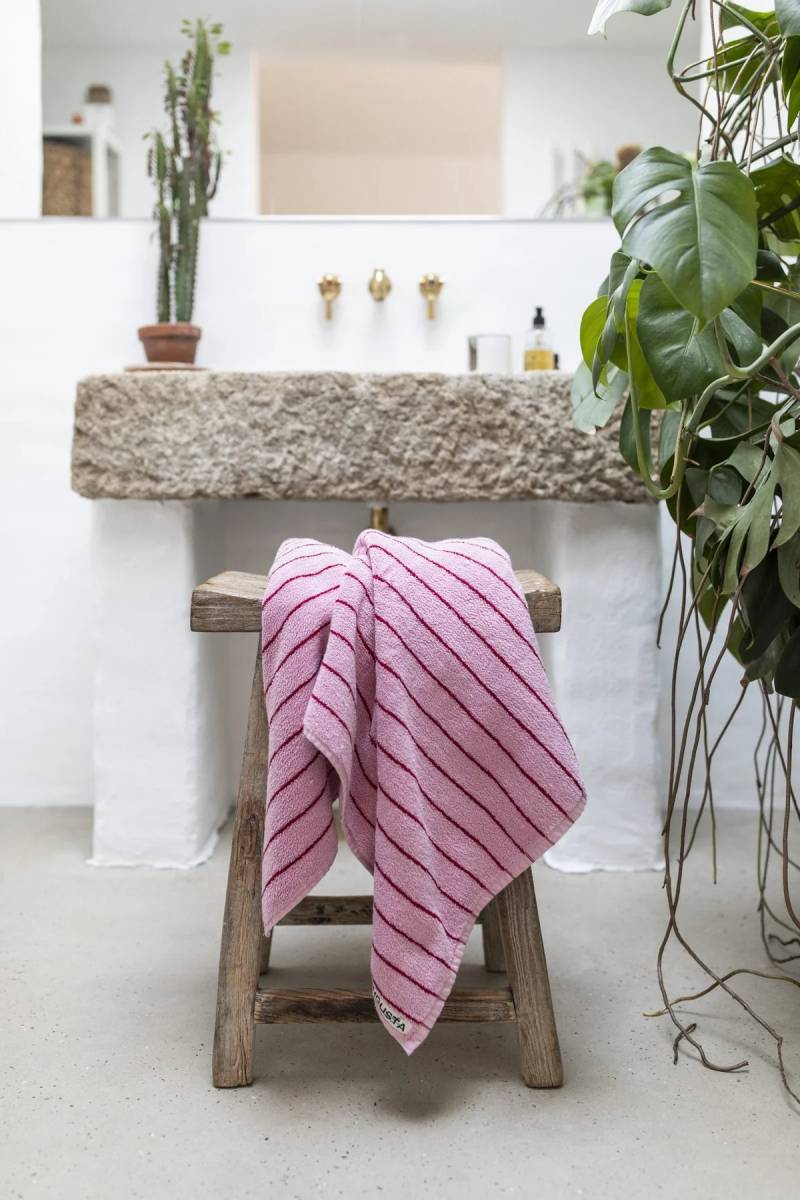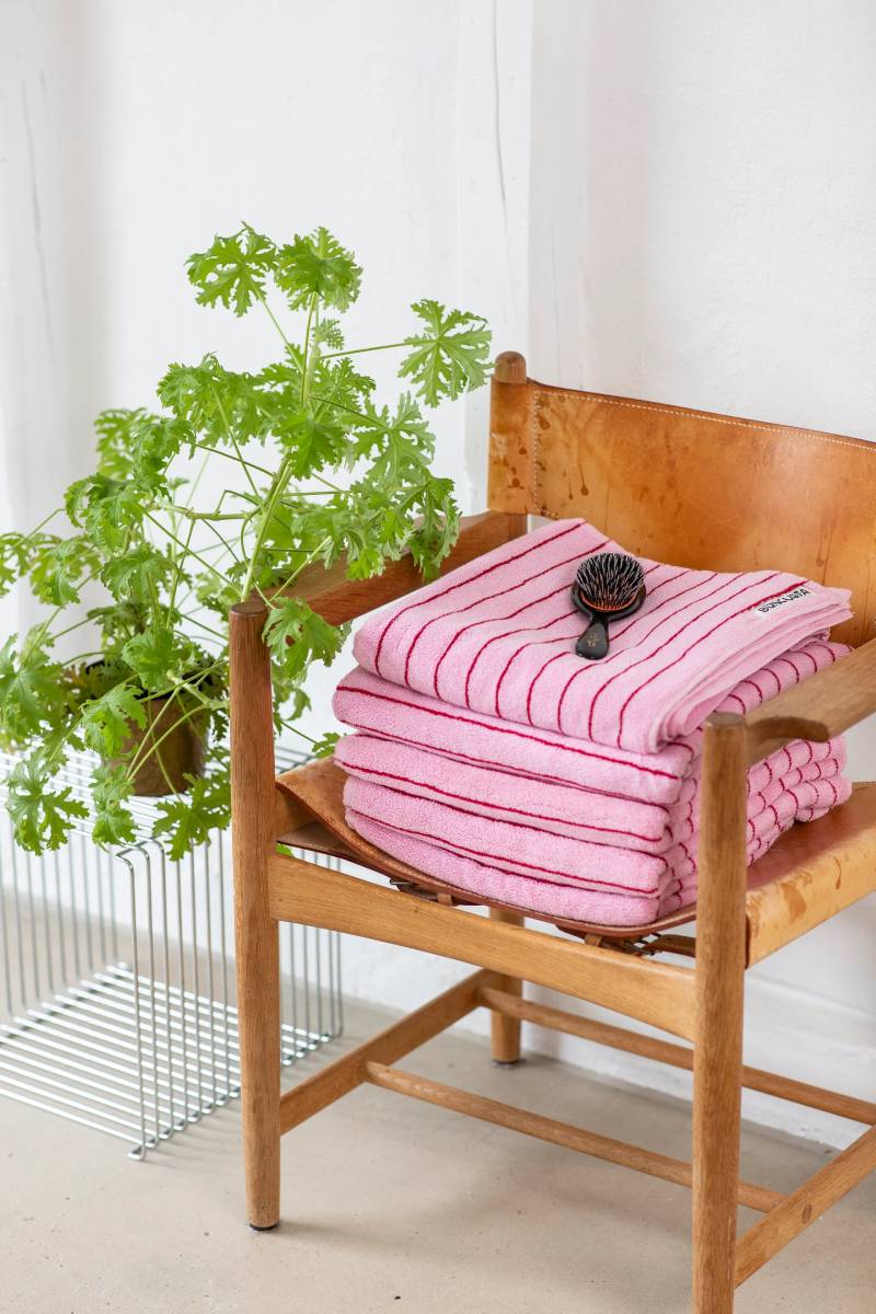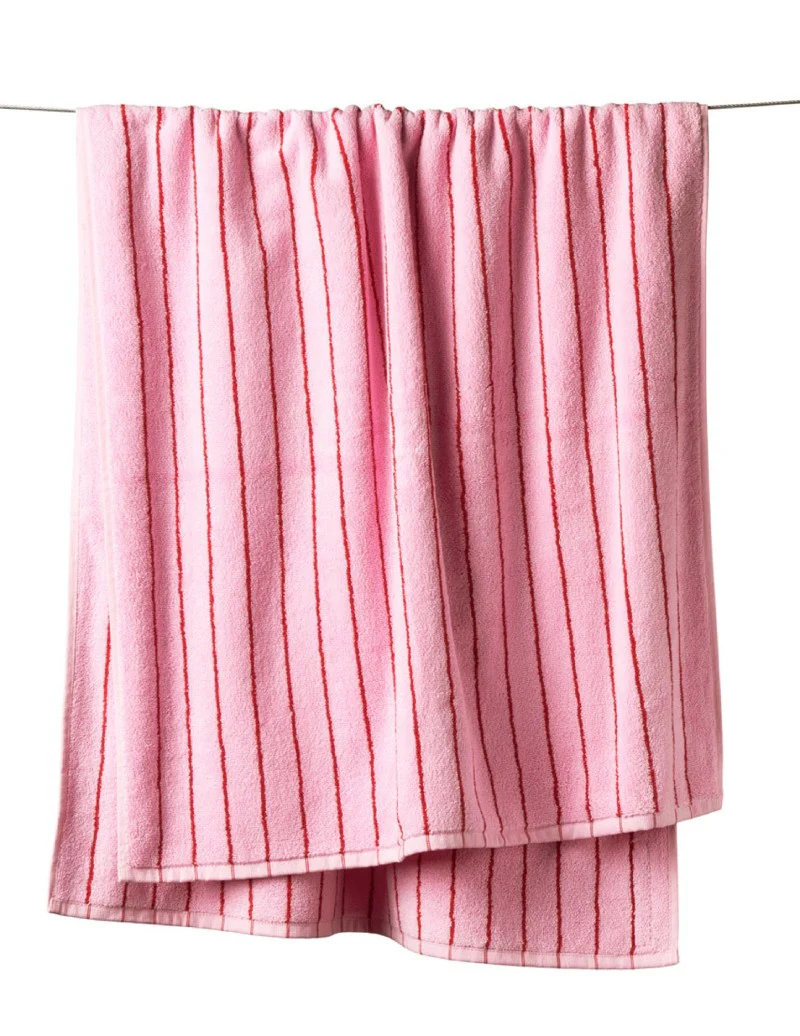 Flauschiges, gestreiftes Naram Badehandtuch in Baby Pink & Ski Patrol vom dänischen Label Bongusta.